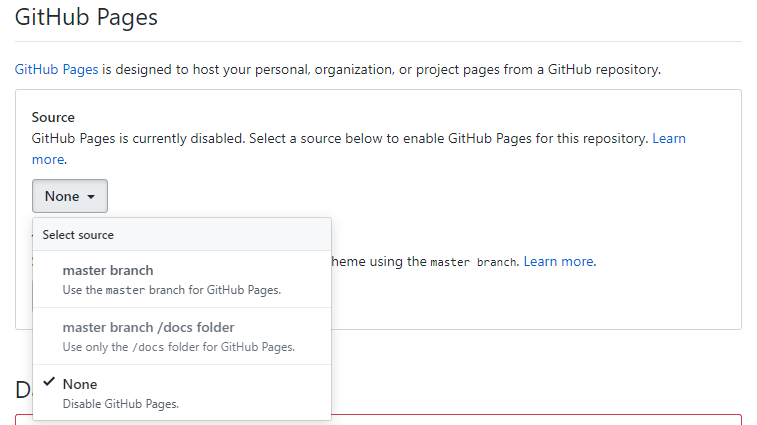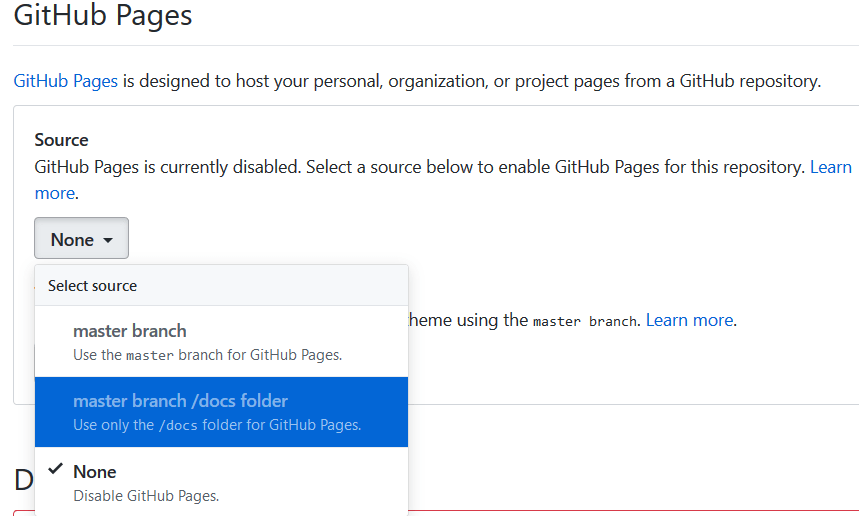 However there is one more option, if you create a branch called gh-pages, it will also be listed as a source inside the selection box shown above.